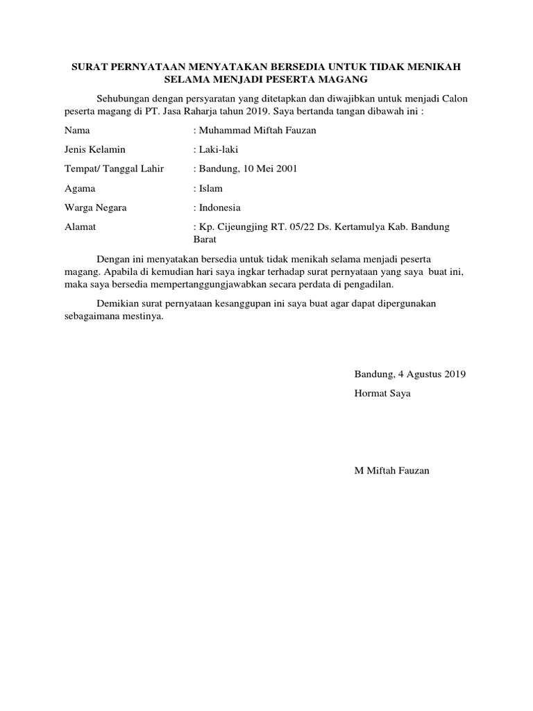 Berikut ini adalah cuplikan isi surat pernyataan bersedia tidak menikah selama magang di jasa raharja terbaru menyatakan untuk tidak akan menikah selama menjadi peserta magang di pt jasa raharja. Contoh surat pernyataan tidak menikah selama pendidikan.menikah dan tidak akan menikah selama menjalani pendidikan dinas di akademi militer. Surat pernyataan kesanggupan merupakan jenis surat formal yang berisi suatu pernyataan akan keadaan atau kondisi yang sebenarnya. Surat pernyatan orang tua adalah sebuah surat pernyataan yang dikeluarkan oleh orang tua yang mana di dalam surat ini secara tegas berisi tentang pernyataan orang tua mengenai sesuatu yang kebanyakan menyangkut anaknya karena mungkin sebelumnya anaknya sudah melakukan sesuatu. Contoh surat pernyataan diri sanggup mengikuti magang. Surat pernyataan diperlukan untuk keadaan tertentu seperti melamar pekerjaan. .dengan sesungguhnya bahwa saya belum menikah dan tidak akan menikah selama mengikuti program pendidikan profesi guru (ppg) prajabatan bersubsidi tahun 2017. Siswa tidak akan dan tidak sedang terlibat baik langsung ataupun tidak langsung dengan. Saya yang bertanda tangan di bawah ini: Menyatakan dengan sesungguhnya bahwa saya belum menikah dan tidak akan menikah selama mengikuti program pendidikan profesi guru (ppg) prajabatan. Contoh surat pernyataan kesanggupan kerja, belum menikah, bebas narkoba, praktik umum, kehilangan stnk, bpkb, sim, dalam bahasa inggris, dll. Surat pernyataan yang bertanda tangan di bawah ini: Akan tetapi tidak semua hal bisa dilakukan dengan dengan surat elektronik, salah satunya adalah nip.0008978.
